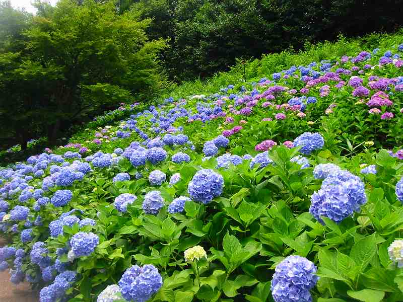 350品種5万株のあじさいが広大な森に包まれるように静かに咲いています。 |