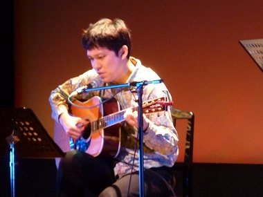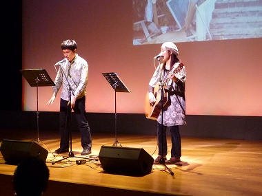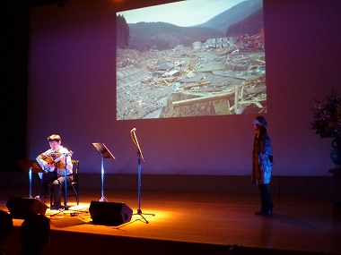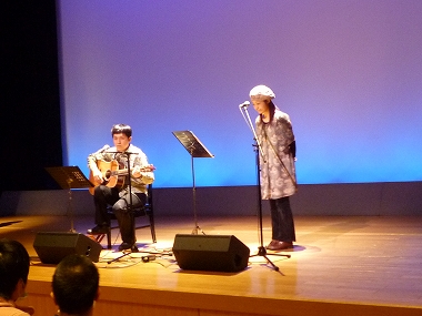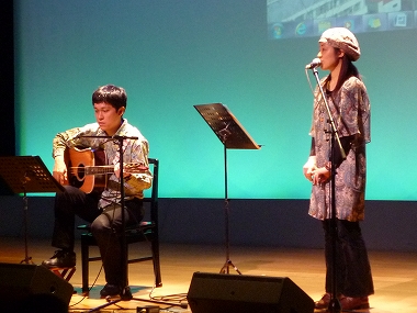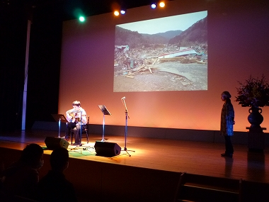 そのオープニングに月陽さんとミニコンサートで共演しました。東日本大震災後のボランティア活動報告のあと、被災地の写真を背景に2曲「ぼくはユニークだねえ」「お母さんあのね」は弾き語り、2曲「上を向いて歩こう」「ふるさと」は月陽さんの伴奏で会場の手拍子に合わせて歌いました。