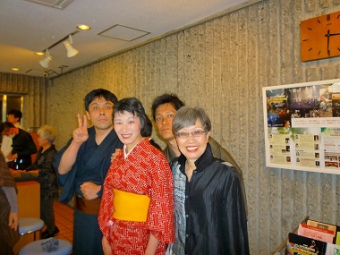 今回、「からだとこころの出会いの会」主催で松井洋子さん演出のこのミュージカルのクライマックスに3人とも出演しました。出演者全員の着物と下駄のダンスがからころと心地よく会場に響きました。