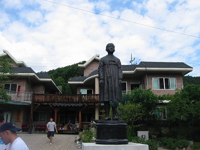 ハルモニたちの住居を前に立つ「手折られた花」の銅像。