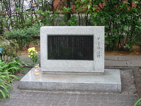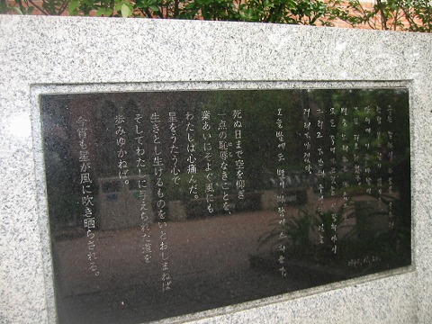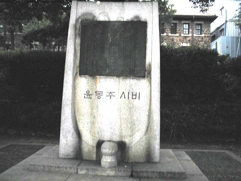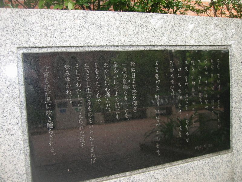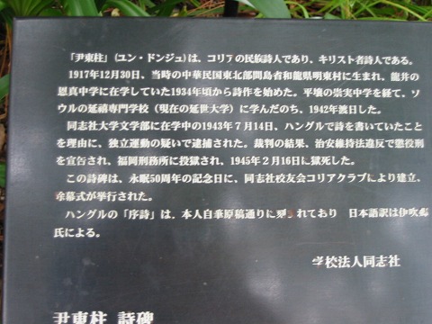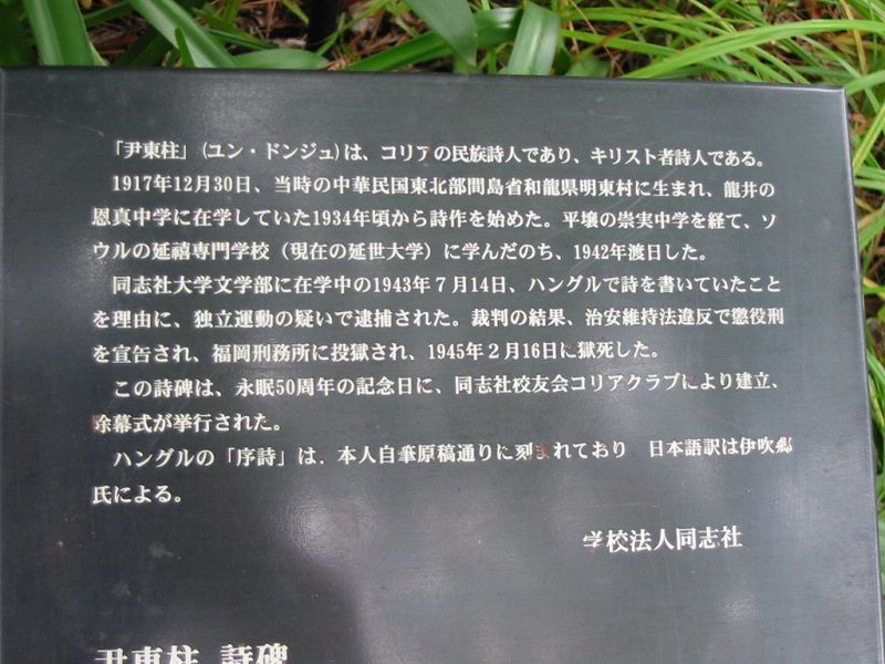 京都の同志社構内にある尹東柱の詩碑。こちらは学生でごったがえすメインストリートの雑踏のすぐわきにひっそりと建っています。