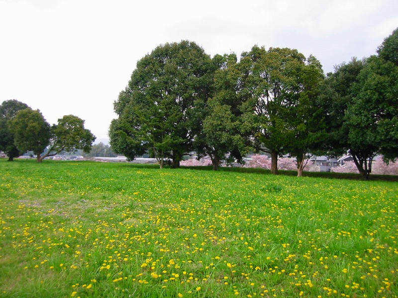 上と同じタンポポ畑です。右には飛鳥川の桜づつみがちょっぴり見えています。 |