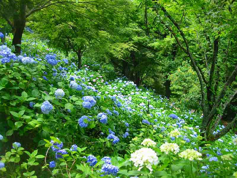 350品種5万株のあじさいが広大な森に包まれるように静かに咲いています。 |