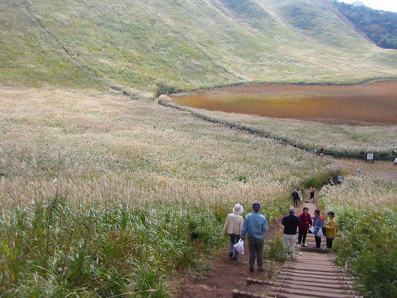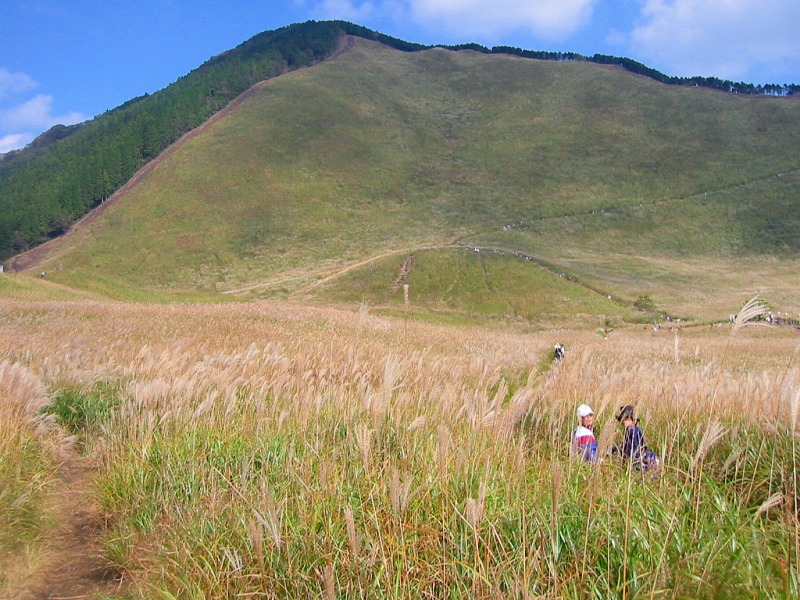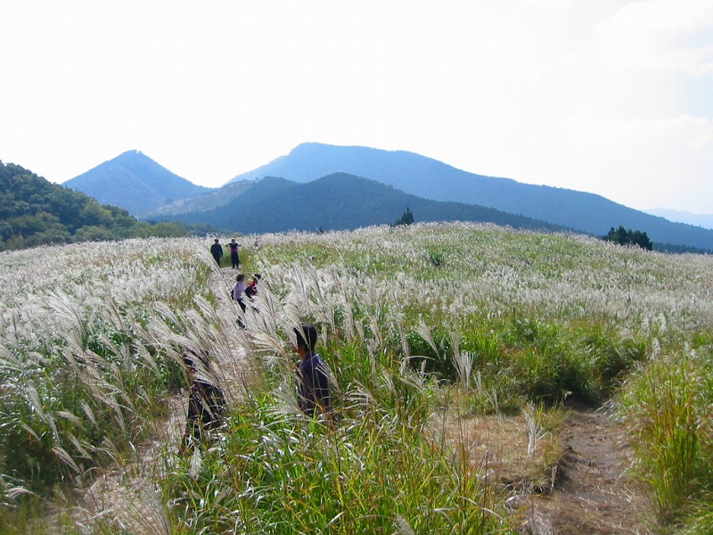広い広いすすきの草原、遠くの方に山の上に上ってゆく人々が小さく小さく見えています。 |