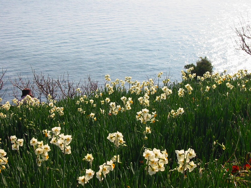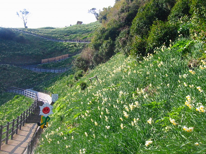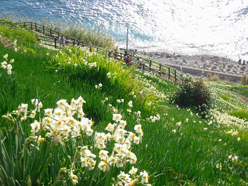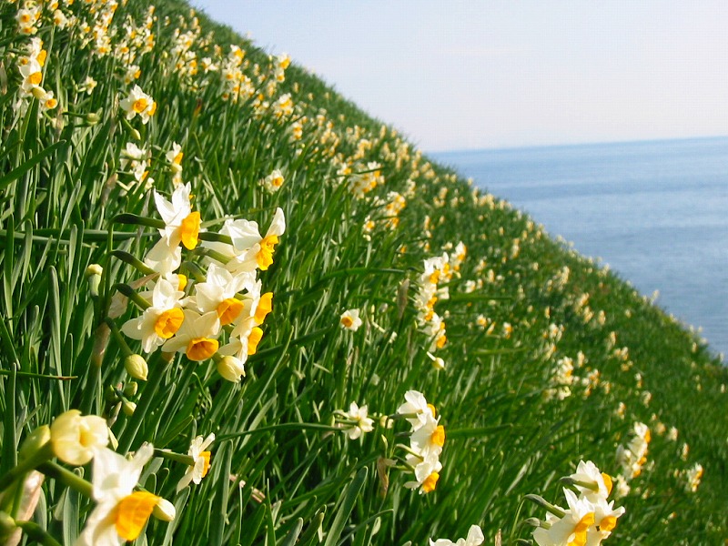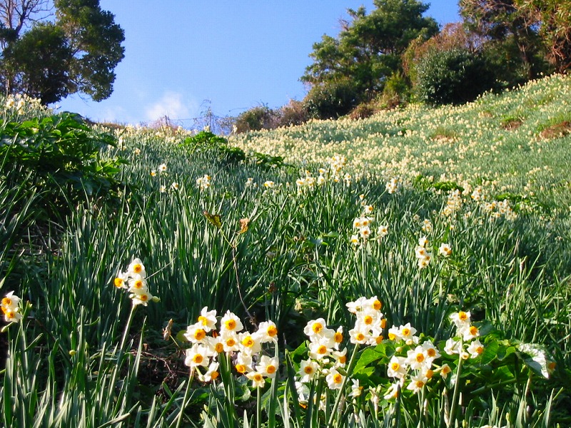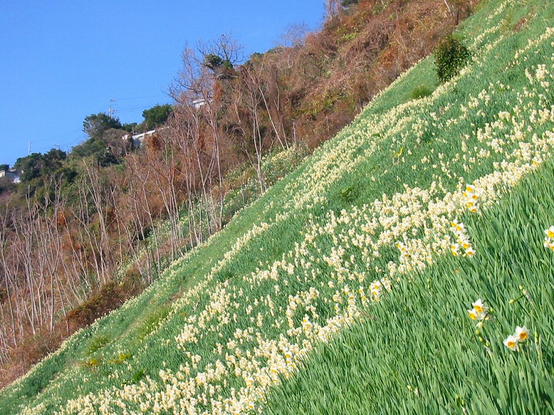 今度は海に向かっての下り坂。明るい日差しの中、海に向かって水仙の花がいっせいに咲きほこります。 |