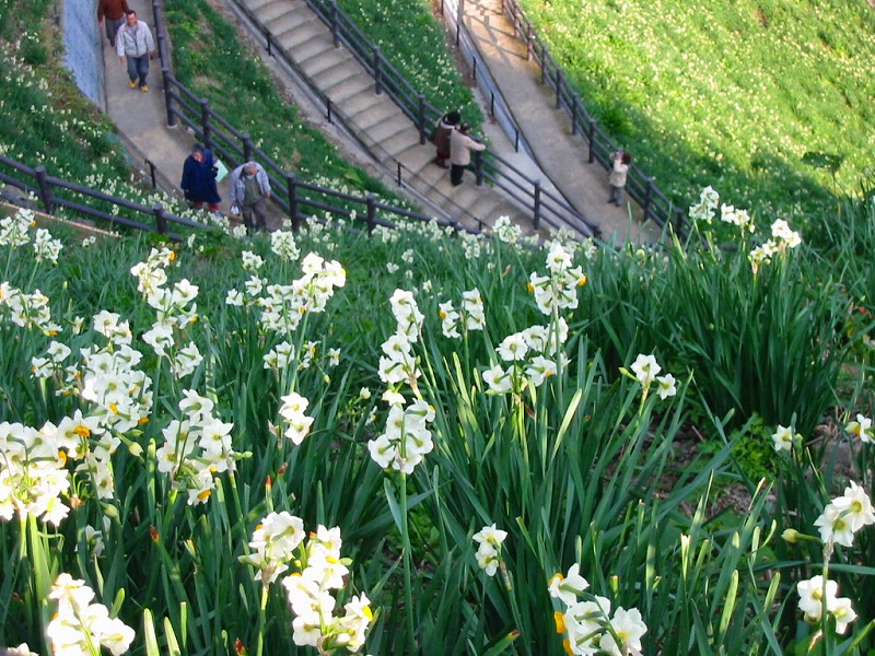 水仙でいっぱいの丘をながめながらゆっくり登っていきます。 |