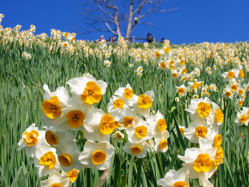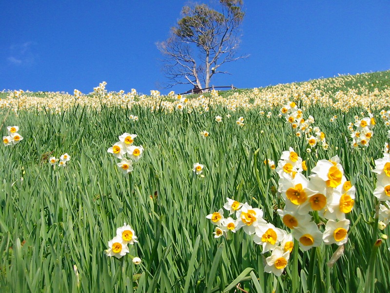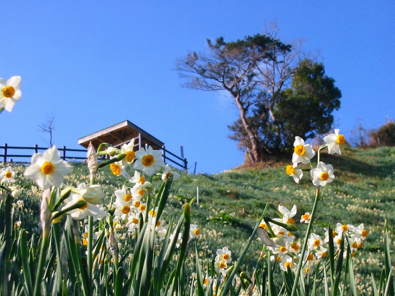 丘の斜面いっぱいに咲いている水仙の花。冬の澄んだ青空をバックに咲きほこっています。 |