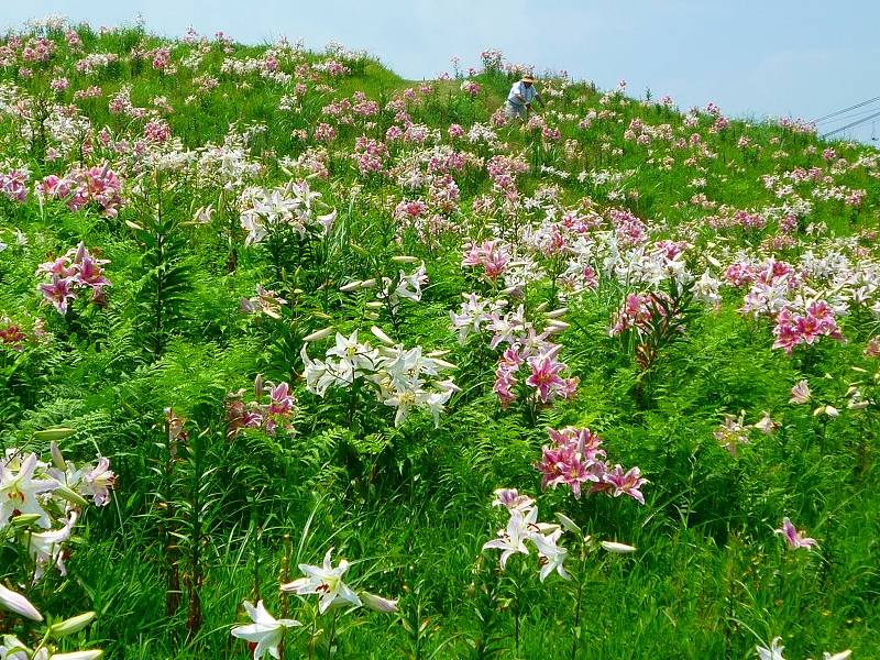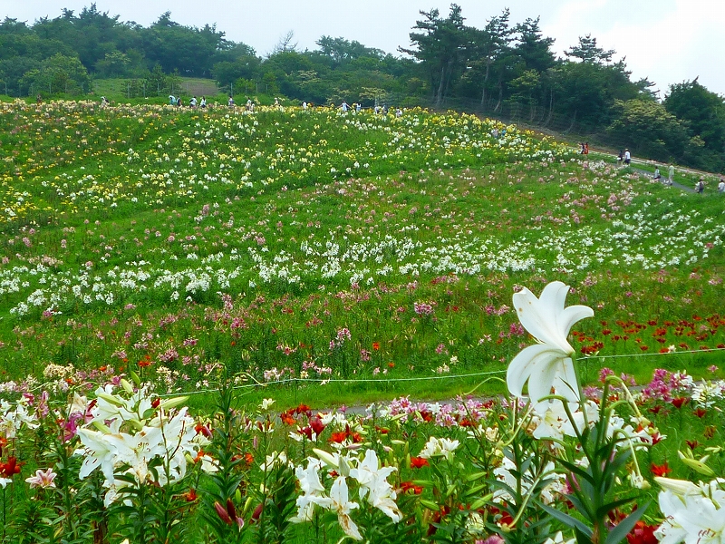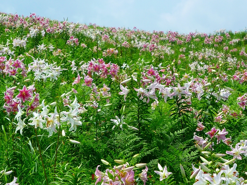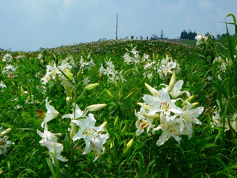 広々とした山頂いっぱいにユリの花が咲き誇ります。 |