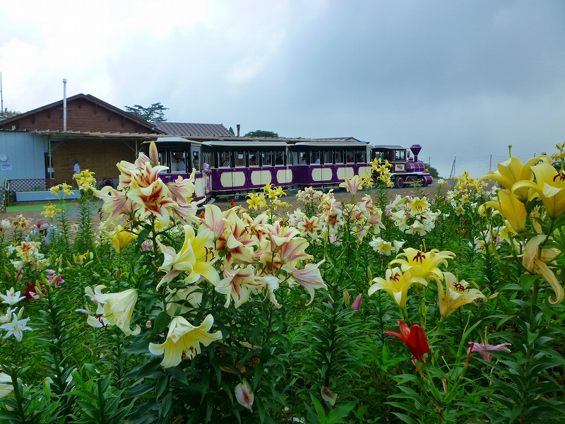 ユリの花園の中を行く汽車ポッポ型の園内バス。ゆっくりゆっくり走ります。 |